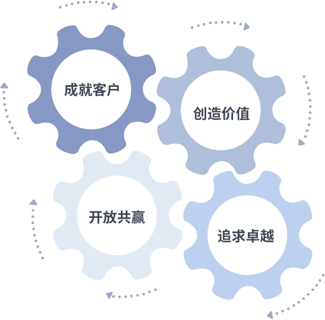成就客户是一切决策的出发点,,,创造价值是衡量所有工作的标准,,,,追求卓越是我们做事做人的态度,,,开放共赢是我们的格局也是最终的结果。。。价值观的齿轮环环相扣,,推动着组织里的每个人不断向前。。。。